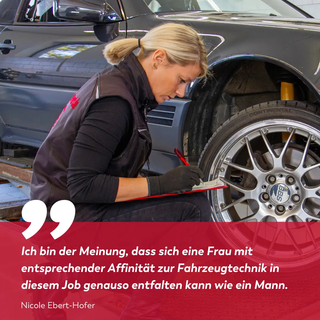 Nicole Ebert-Hofer wurde das Technikverständnis von ihrem Vater – Gründungsmitglied der KÜS – in die Wiege gelegt. Sprüche wie: „Kann die das überhaupt?“ sind Nicole Ebert-Hofer dennoch nicht fremd – vor allem in der Anfangszeit wurde sie durchaus mit solchen Aussagen konfrontiert. Doch in den letzten Jahren hat sich ihrer Erfahrung nach einiges verändert. „Es gibt tatsächlich einige Kunden, gerade auch wirklich Frauen, die zu uns kommen und fragen: ‚Ist die Prüferin da? Kann die Prüferin mein Auto prüfen?‘“. Nicole Ebert-Hofer hat sich über ihre erworbenen Zusatzqualifikationen im Bereich der Arbeitssicherheit als Sicherheitsingenieurin und als Unterschriftsberechtigte (USB) des Technischen Dienstes der KÜS einen Namen gemacht. Als USB führt sie Sonderabnahmen im Einzelgenehmigungsverfahren durch und arbeitet unterer anderem mit sehr namhaften internationalen Tunern dieser Branche zusammen. „Ich bin der Meinung, dass eine Frau mit entsprechender Affinität zur Fahrzeugtechnik sich in diesem Job genauso entfalten kann wie ein Mann!“ – so ihr Statement dazu.