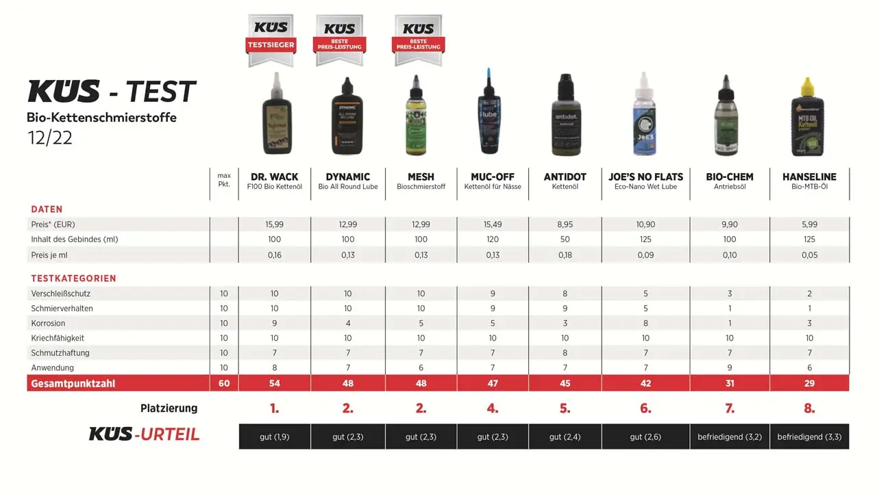 Testsieger bei den Bio-Ölen mit der Gesamtnote 1,9 ist das Dr. Wack F100 Bio Kettenöl (15,99 Euro), dicht gefolgt von den beiden Preis-Leistungs-Siegern Dynamic Bio All Round Lube (12,99 Euro) und Mesh Bioschmierstoff (12,99 Euro) sowie dem Muc-Off Kettenöl für Nässe (15,49 Euro) – allesamt gleichauf mit der Note 2,3 (siehe Ergebnistabelle). Das nachhaltige Wack Bio-Öl steht bei seinen Leistungen in den einzelnen Testpunkten dem klassischen Wack-Kettenöl in nichts nach. Auch Dynamic, Mesh und Muc Off schmieren beim Test auf dem Prüfstand bestens und liefern insgesamt eine gute Performance. Deshalb für alle drei Produkte die Note 2,3.