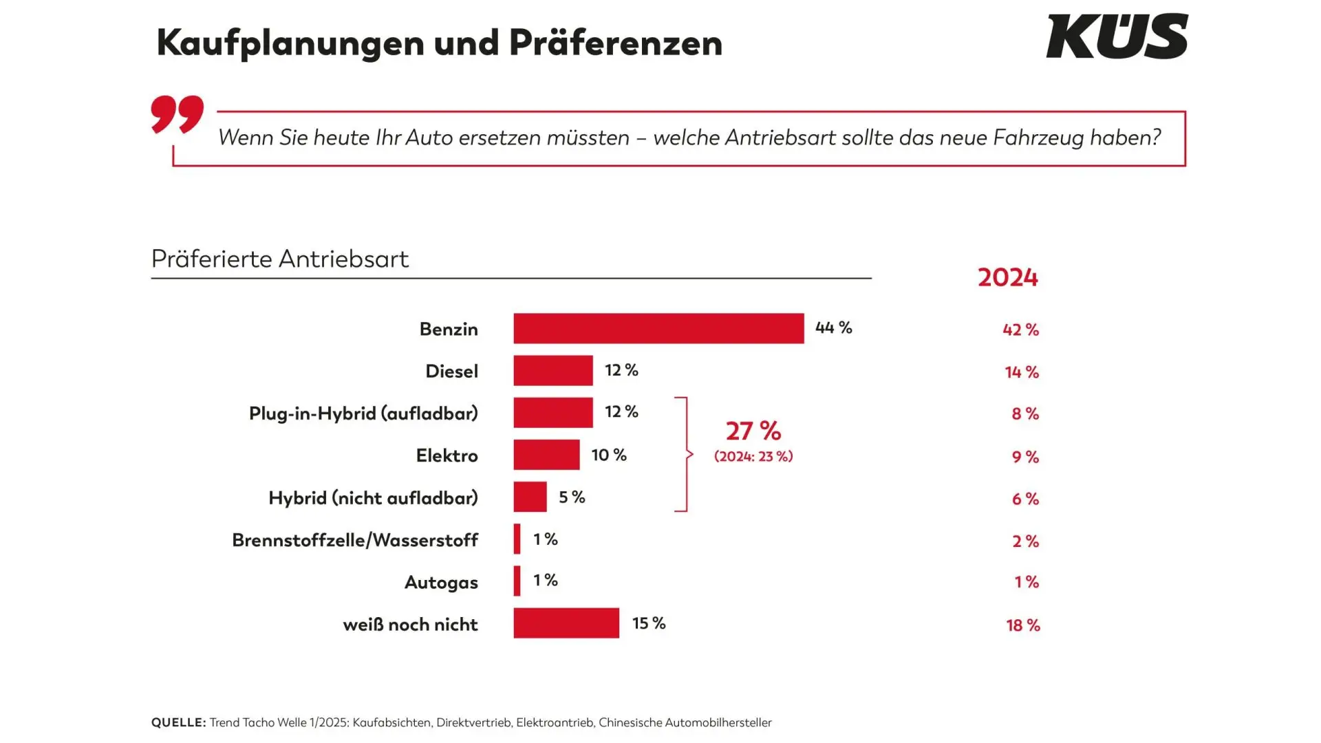 Der Trend-Tacho wird für die KÜS und das Fachmagazin kfz-betrieb von Wolk & Nikolic After Sales Intelligence GmbH (Köln) erstellt. Es handelt sich um eine Mixed-Mode-Befragung, telefonisch (CATI) von 300 Personen und online (CAWI) von 700 Personen. Zielpersonen sind Pkw-Fahrer, die im Haushalt für Fragen rund um das Auto mitverantwortlich sind. Die Befragung wurde im Februar 2025 durchgeführt. Die Gewichtung der Befragungsergebnisse erfolgt mit den KBA-Daten (Bestandsanteile Pkw-Marken, Alterssegmente).