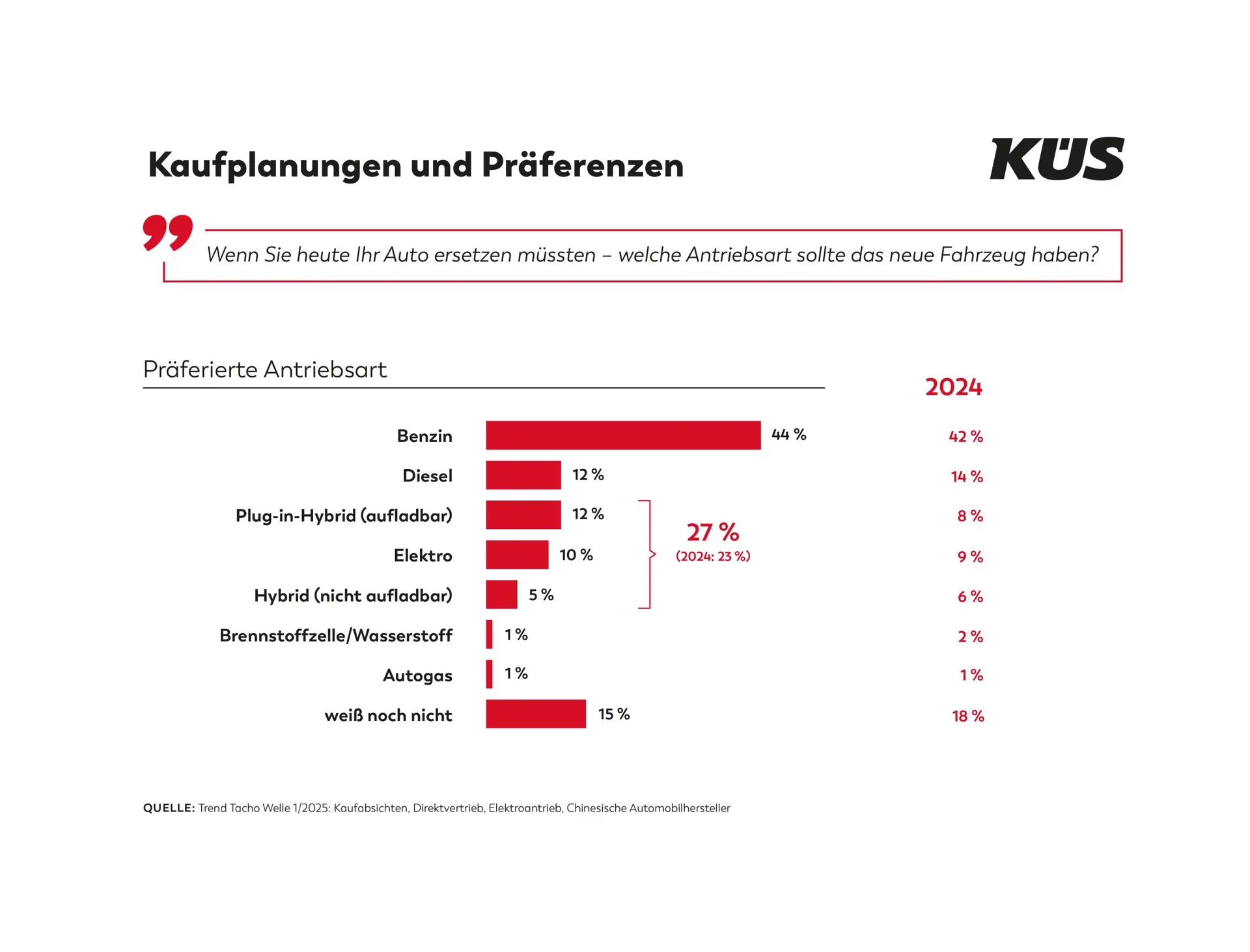 Im Vergleich zum Vorjahreszeitraum gewinnt damit der Plug-in-Hybrid am meisten an Beliebtheit. Ihn hatten 2024 nur 8 % der Befragten als bevorzugten Antrieb bei einem Neufahrzeug genannt. Alle anderen Zahlen sind nahezu gleich geblieben. Die Favoritenrolle der Verbrennungsmotoren insgesamt (Benziner plus Diesel) ist mit56 % sogar zahlenmäßig identisch geblieben, jedoch hat sich die Gewichtung 2025 leicht zugunsten der Benziner verschoben.