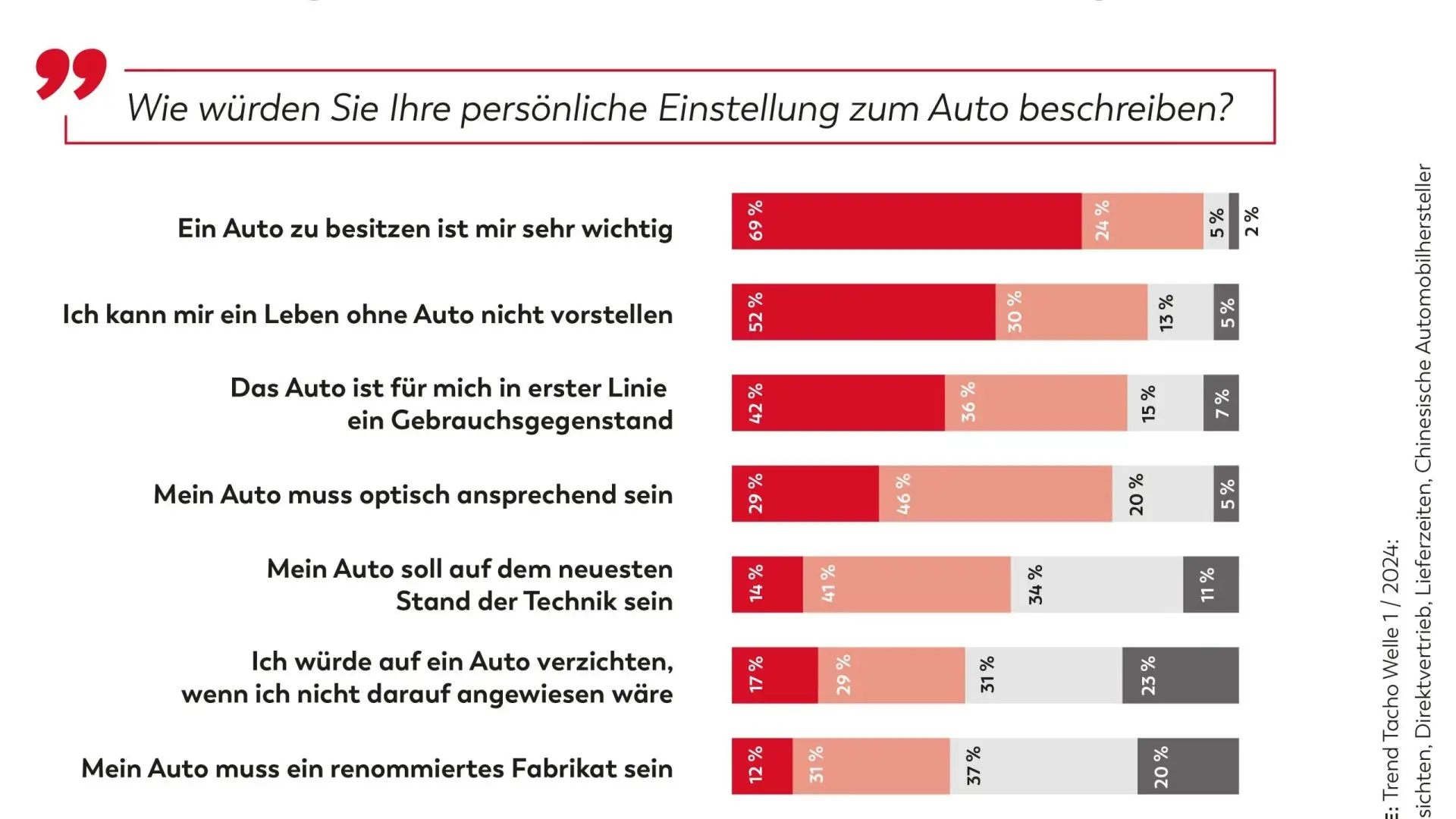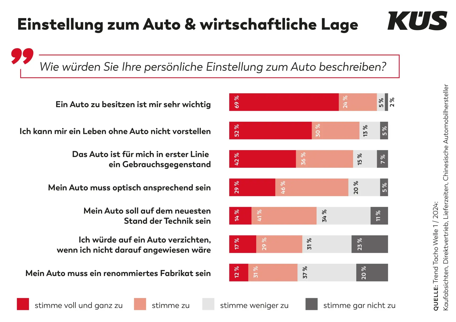 69 % der Befragten geben entschieden an, dass ihnen der Besitz eines Autos sehr wichtig ist. 24 % bejahen dies, nur insgesamt 7 % räumen dem eigenen Auto keine hohe Wichtigkeit ein. Dass ein Leben ohne Auto für sie unvorstellbar sei, betont die Hälfte der Umfrageteilnehmer (52 %) klar und eindeutig, 30 % stimmen dem zu, 13 % stehen der Frage eher verneinend gegenüber und nur 5 % verneinen sie wirklich entschieden.