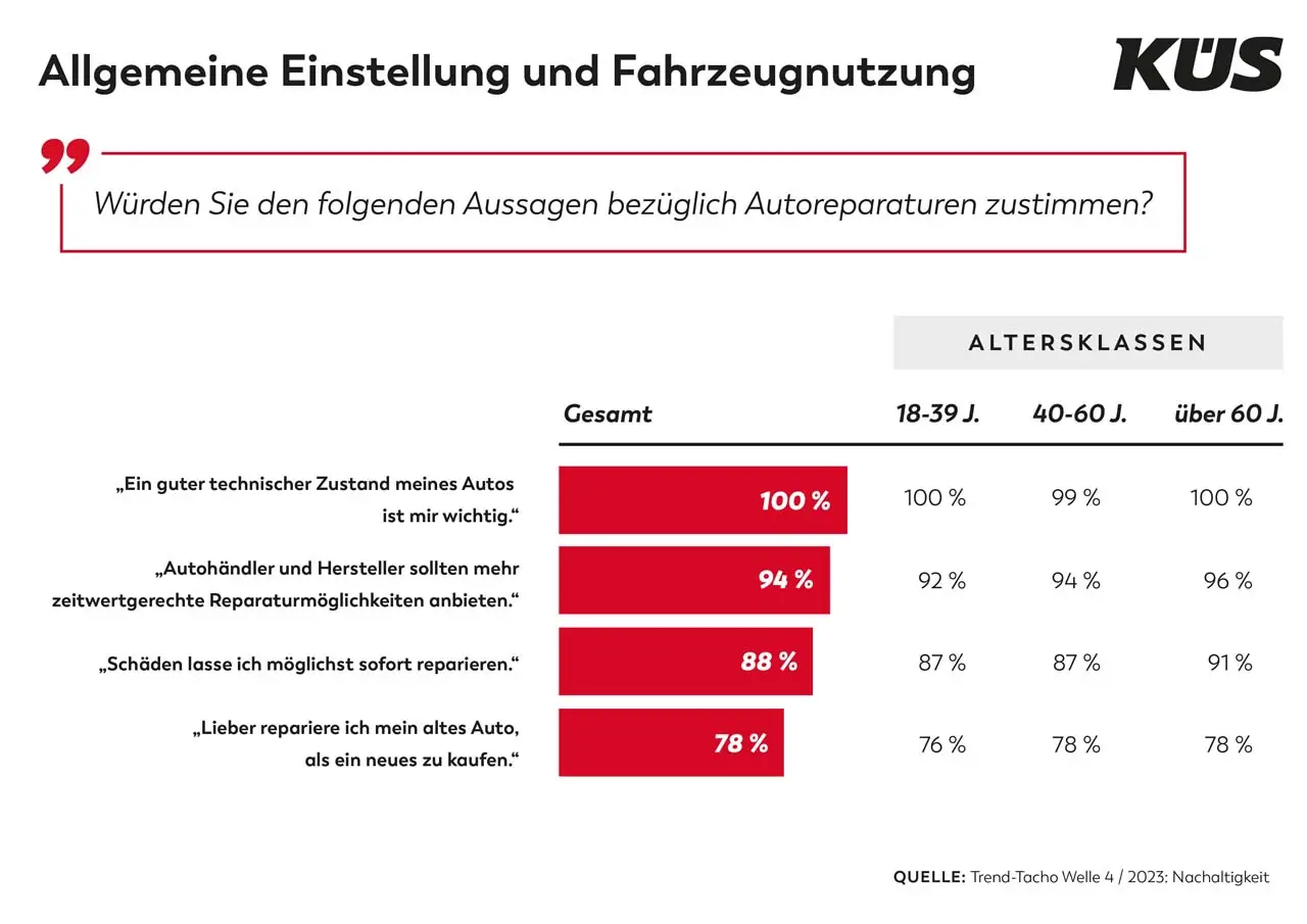 Wie gehen die Autobesitzer unter dem Aspekt der Nachhaltigkeit mit ihrem Auto um? Sehr bewusst, das ist das klare Ergebnis des KÜS-Trend-Tacho zum Thema: 78 % ziehen es vor, das vorhandene Auto gegebenenfalls reparieren zu lassen, statt ein neues zu kaufen. 88 % der Befragten lassen Schäden am Auto nach Möglichkeit sofort reparieren, statt erst noch eine Zeit lang abzuwarten. Auch zur Qualität der Reparaturen ist die Auffassung der Autofahrer eindeutig: 94 % wünschen sich, dass Autohändler und Hersteller noch mehr zeitwertgerechte Möglichkeiten der Reparatur anbieten. Der Werterhalt des Autos wird also großgeschrieben.