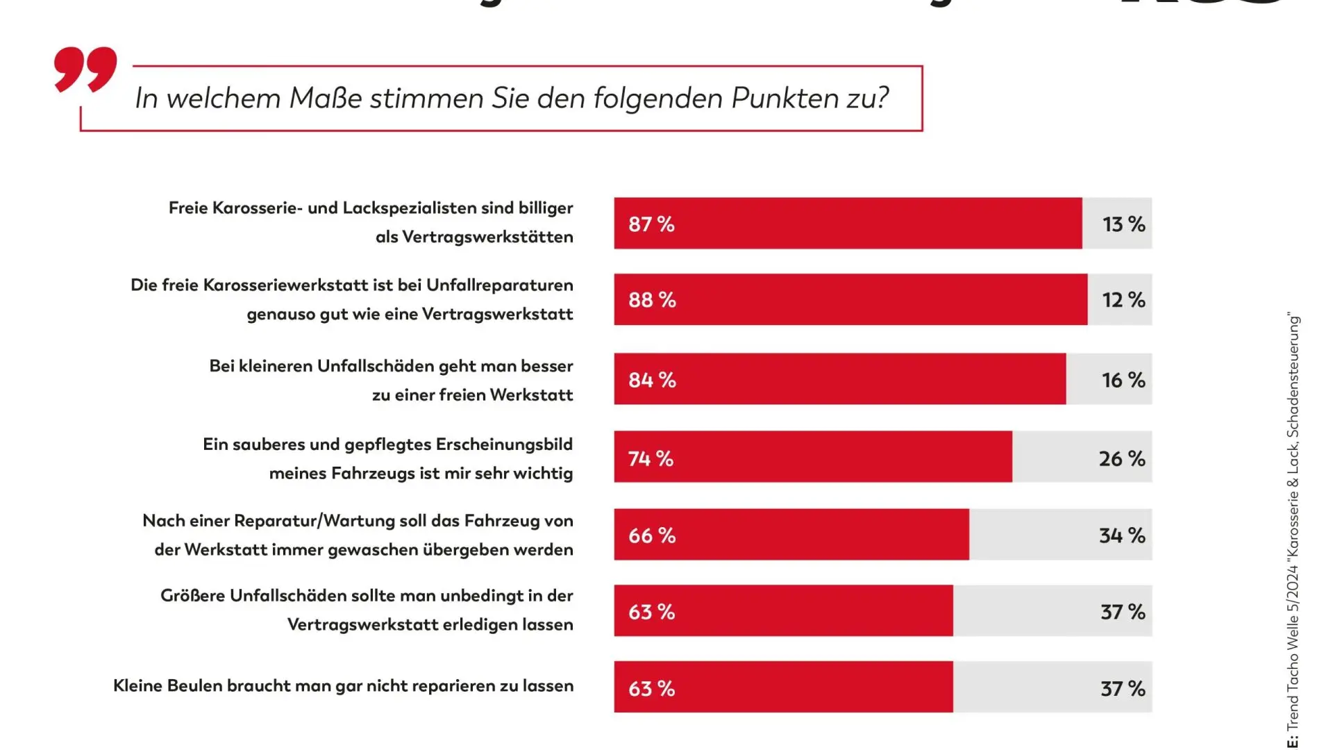 Geht es um die Beseitigung bzw. Reparatur kleinerer Unfallfolgen, haben die freien Werkstätten in der Gunst der Autofahrer die Nase vorn: 84 % der Befragten ziehen sie in dem Fall den Vertragswerkstätten vor. Anders verhält es sich bei größeren Unfallschäden: Geht es hier um die Instandsetzung des Fahrzeugs, ist die jeweilige Vertragswerkstatt überwiegend der Kundenfavorit (63 %).