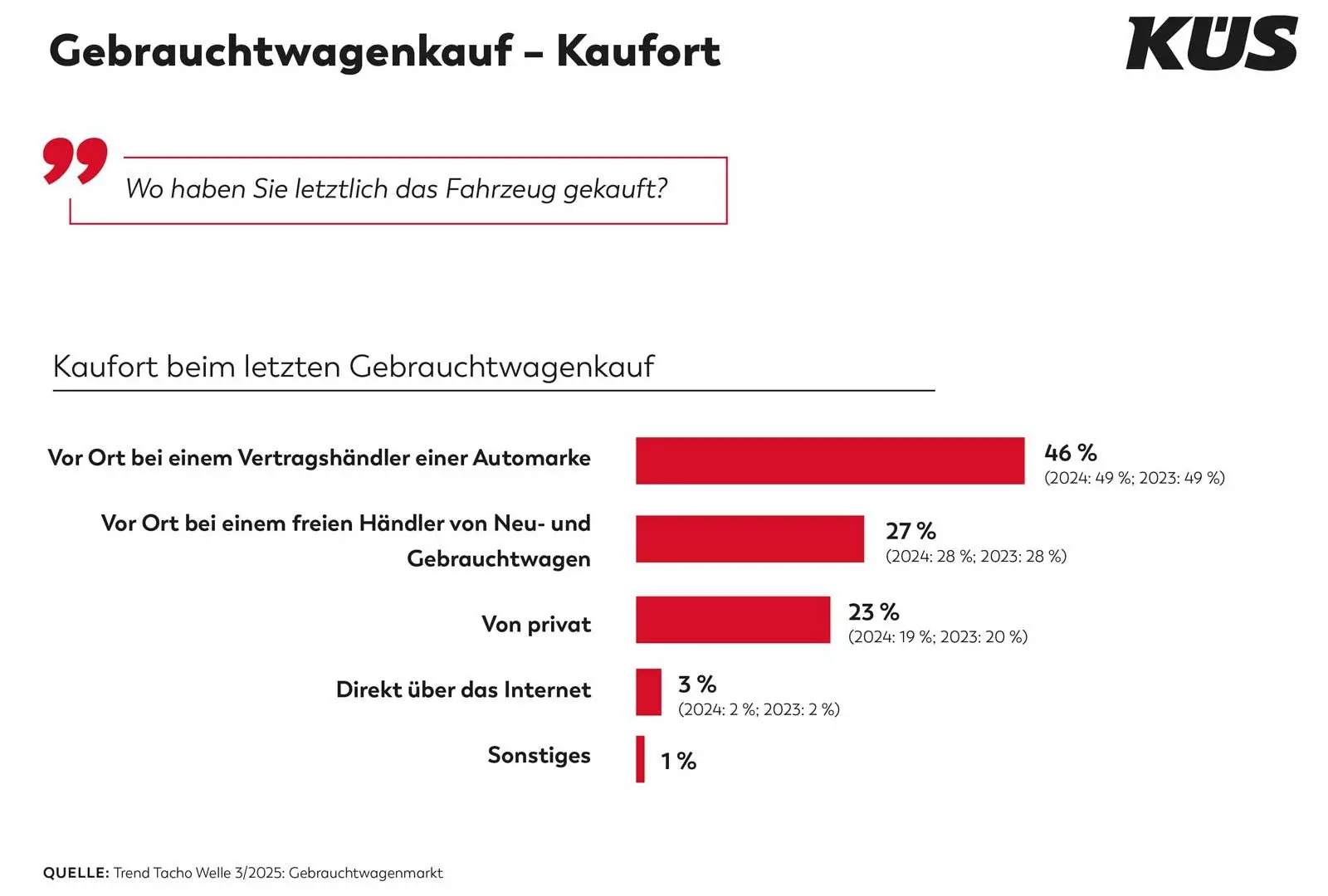 So vielfältig die Gründe dafür sein mögen – der Gebrauchtwagenkauf ist und bleibt absolute Vertrauenssache. Nur 3 % der Befragten gaben an, ihren letzten Gebrauchten direkt über das Internet erworben zu haben. Die Favoriten beim Gebrauchtwagenkauf sind deutlich verteilt: 46 % suchten ihr Fahrzeug beim Vertragshändler einer bestimmten Automarke vor Ort aus. 27 % der Befragten entschieden sich für einen freien, also nicht markengebundenen Händler für Neu- und Gebrauchtfahrzeuge. Selbst der Kauf und Verkauf „von privat zu privat“ liegt in der Gunst der Interessenten noch deutlich vor der rein digitalen Variante: 23 % wählten bei ihrem letzten Gebrauchtwagenkauf diesen Weg.