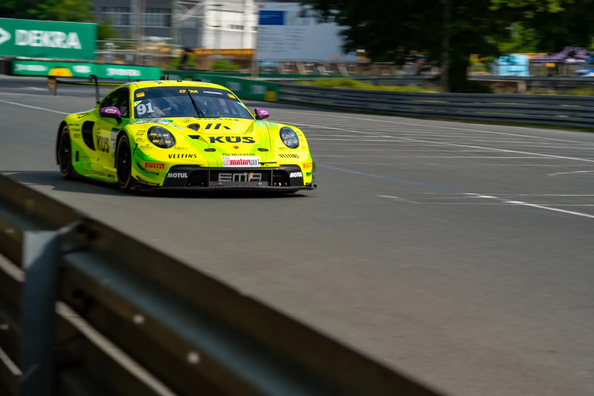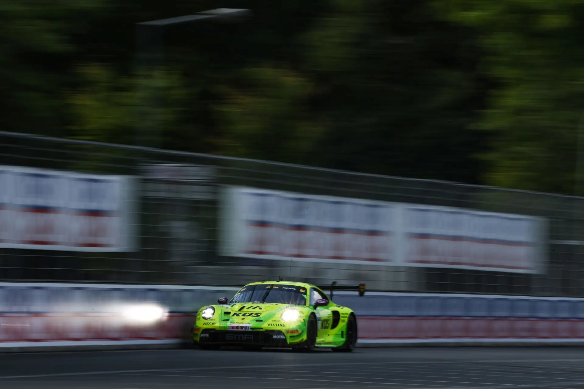 In das erste Rennen in Nürnberg starteten die Manthey-Piloten von den Plätzen vier (Preining), achtzehn (Güven) und neunzehn (Schuring). Preining hielt seine Position bis zur Boxeneinfahrt und beendete das Rennen schließlich auf dem zweiten Rang. Ayhancan Güven kehrte nach seinem Boxenstopp auf Rang elf auf die Strecke zurück und brachte diese Platzierung auch ins Ziel. Morris Schuring wurde bei noch 17 verbleibenden Rennminuten auf der Strecke gedreht, schaffte es aber dennoch auf Platz 14 – ebenfalls in die Punkte.