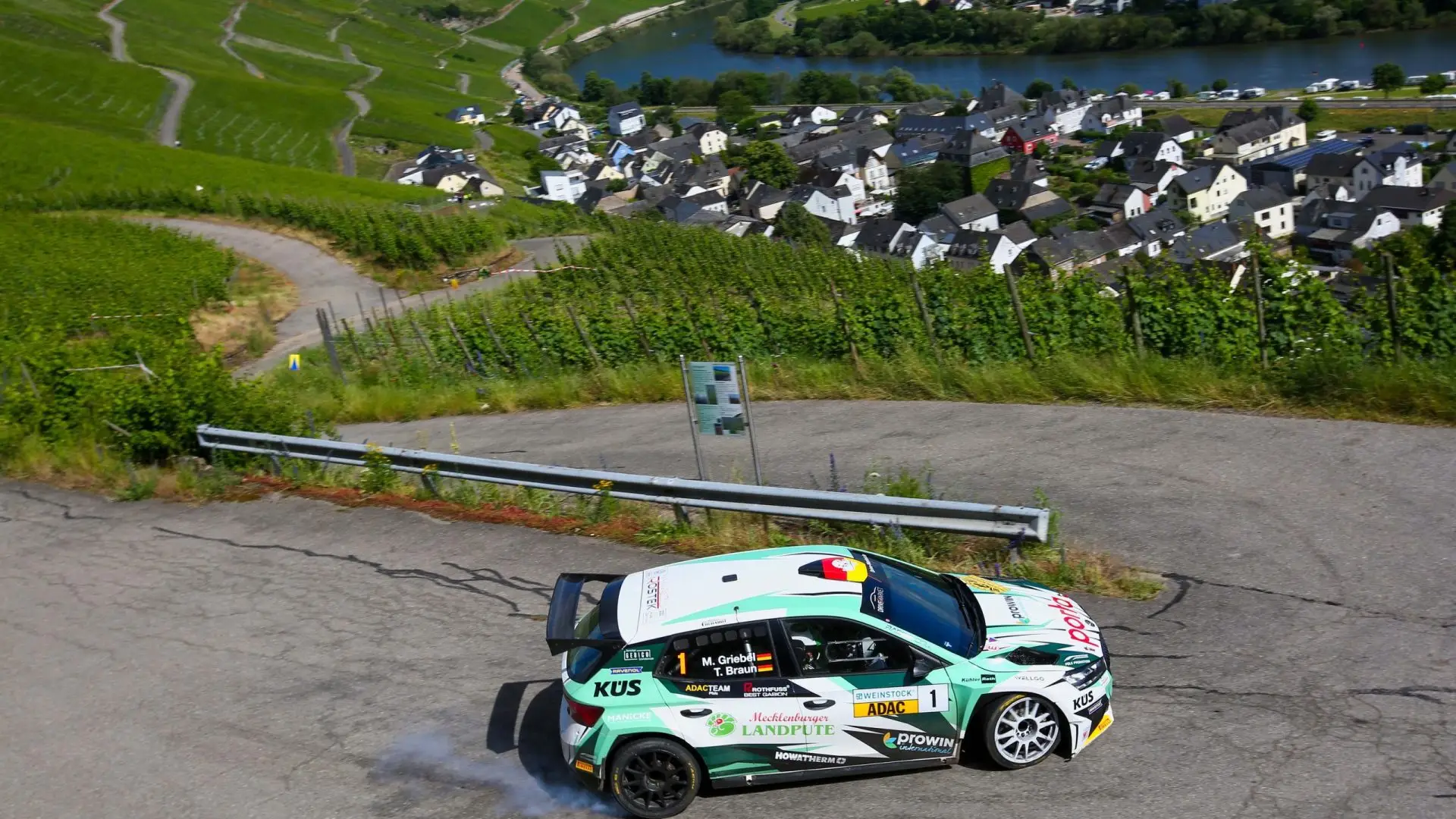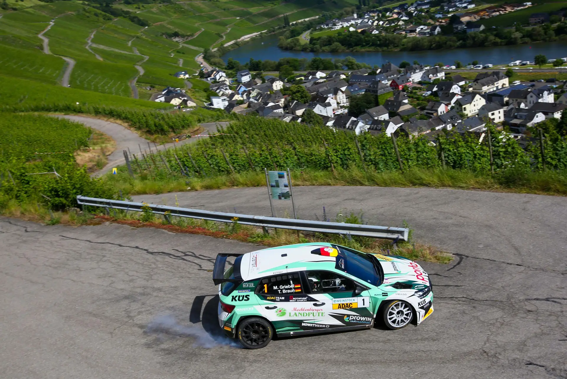 Ein weiterer Hattrick ist perfekt: DRM-Champion Marijan Griebel hat zum dritten Mal hintereinander die Rallye ADAC Mittelrhein gewonnen und feierte gleichzeitig den dritten DRM-Sieg in Folge. Der von der KÜS unterstützte DRM-Champion war mit Co Tobias Braun im Škoda Fabia RS Rally2 schon am Rallye-Samstag erfolgreich. Da wurden die ersten sechs Wertungsprüfungen fast ausschließlich in den Weinbergen über der Mosel ausgetragen wurden. Marijan Griebel erreichte einen Vorsprung von über einer halben Minute, den er am Sonntag auf schnellen Asphalt-Strecken verteidigte.