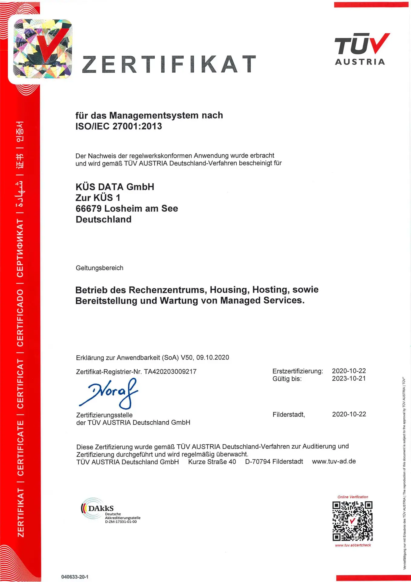 Das Rechenzentrum der KÜS DATA GmbH hat die Zertifizierung nach ISO 27001 erhalten, womit ihr ein funktionales Informationssicherheits-Managementsystem (ISMS) bestätigt wird. Für die Kunden des Rechenzentrums bedeutet dieses außerordentliche Qualitätsmerkmal höchsten Datenschutz und Sicherstellung der Integrität betrieblicher Daten durch geprüfte Abläufe unter Einhaltung der entsprechenden Normen.