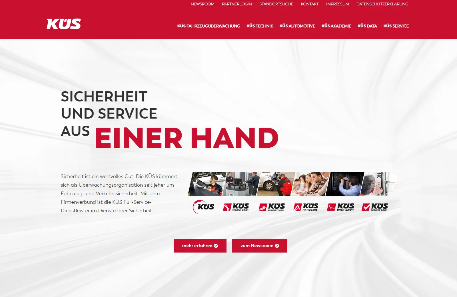 Die Kraftfahrzeug-Überwachungsorganisation freiberuflicher Kfz-Sachverständiger e. V. (KÜS) ist einst angetreten als Technischer Überwacher zur Durchführung der gesetzlich geregelten Fahrzeugprüfungen wie etwa der Hauptuntersuchung. Inzwischen ist daraus längst ein Komplettdienstleister für die Unternehmen des Kraftfahrzeuggewerbes aber auch der Autofahrerinnen und Autofahrer sowie aller an den verschiedenen Serviceleistungen Interessierten geworden. Nach wie vor ist die Fahrzeugüberwachung die Speerspitze der Organisation, mit einem umfassenden Auftritt innerhalb der neuen Homepage. Direkte Serviceleistungen wie beispielsweise die Suche nach KÜS-Partnern in der Nähe oder die Anforderungen von Kopien des Hauptuntersuchungsberichtes sind leicht zu finden. Die einzelnen Firmenzweige, wie etwa die KÜS Service GmbH oder die KÜS DATA GmbH mit dem hochmodernen Rechenzentrum, haben nun ebenfalls ihre eigene Seite im Internet und bieten somit noch mehr Service für ihre Kunden, natürlich mit der schnellen und unkomplizierten Möglichkeit der Kontaktaufnahme mit den zuständigen Ansprechpartnern.