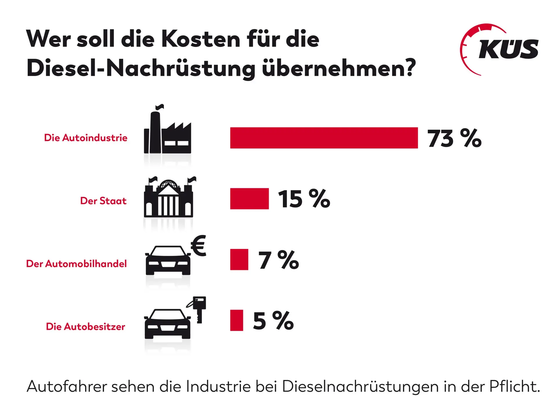 Die aktuelle Umfrage des KÜS Trend-Tacho liefert beim Thema Dieselproblematik eindeutige Ergebnisse. Ganz klar wird die Verantwortung auf Seiten der Hersteller gesehen. So erwarten 73 % der Befragten die Übernahme der Kosten für die Nachrüstung von der Industrie, 15 % sehen den Staat in der Pflicht, 7 % den Automobilhandel und nur 5 % die Autobesitzer.