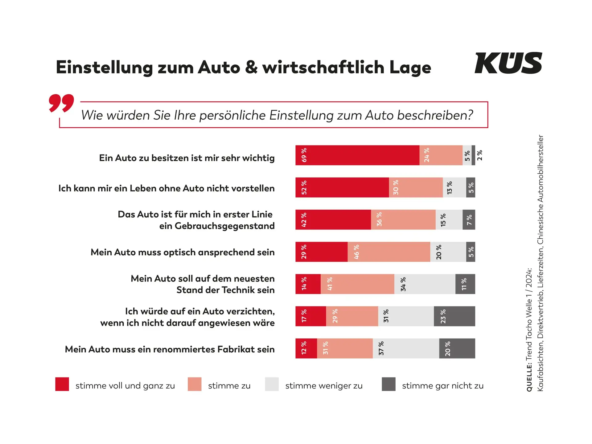 69 % der Befragten geben entschieden an, dass ihnen der Besitz eines Autos sehr wichtig ist. 24 % bejahen dies, nur insgesamt 7 % räumen dem eigenen Auto keine hohe Wichtigkeit ein. Dass ein Leben ohne Auto für sie unvorstellbar sei, betont die Hälfte der Umfrageteilnehmer (52 %) klar und eindeutig, 30 % stimmen dem zu, 13 % stehen der Frage eher verneinend gegenüber und nur 5 % verneinen sie wirklich entschieden.