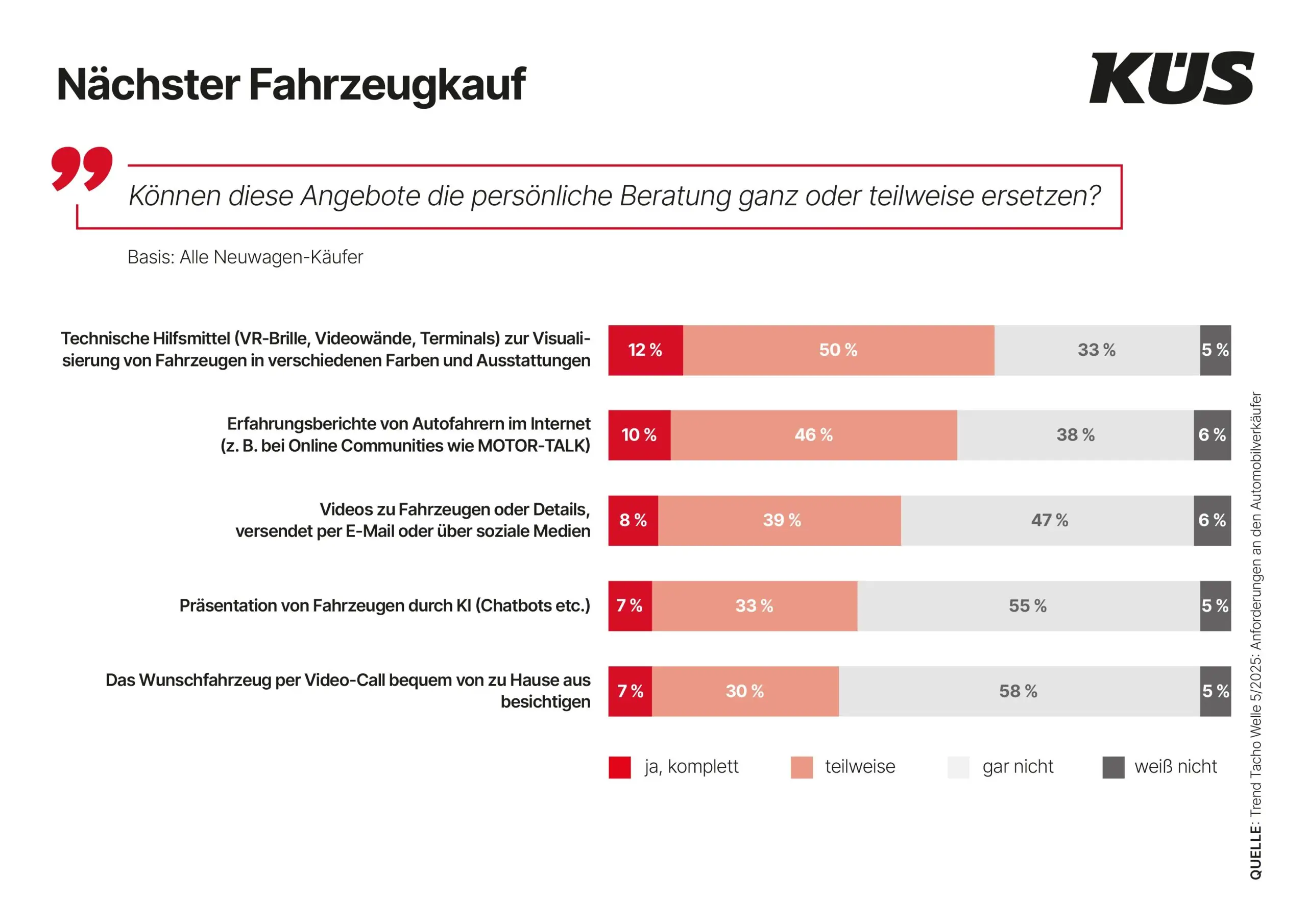 Technische Hilfsmittel wie Virtual-Reality-Brillen oder Videowände finden 12 % der Befragten beim Neuwagenkauf attraktiv, für 50 % sind sie nur teilweise interessant. 38 % zeigen sich skeptisch oder unentschlossen. Ähnlich wird die Nutzung von Internetforen eingeschätzt: 10 % sehen darin einen Mehrwert, 46 % nur teilweise, während 44 % ihnen skeptisch oder ablehnend gegenüberstehen. Noch geringer ist die Zustimmung zu Videos, die per E-Mail oder über soziale Medien bereitgestellt werden: Nur 8 % finden diese Angebote interessant, 39 % zumindest teilweise.