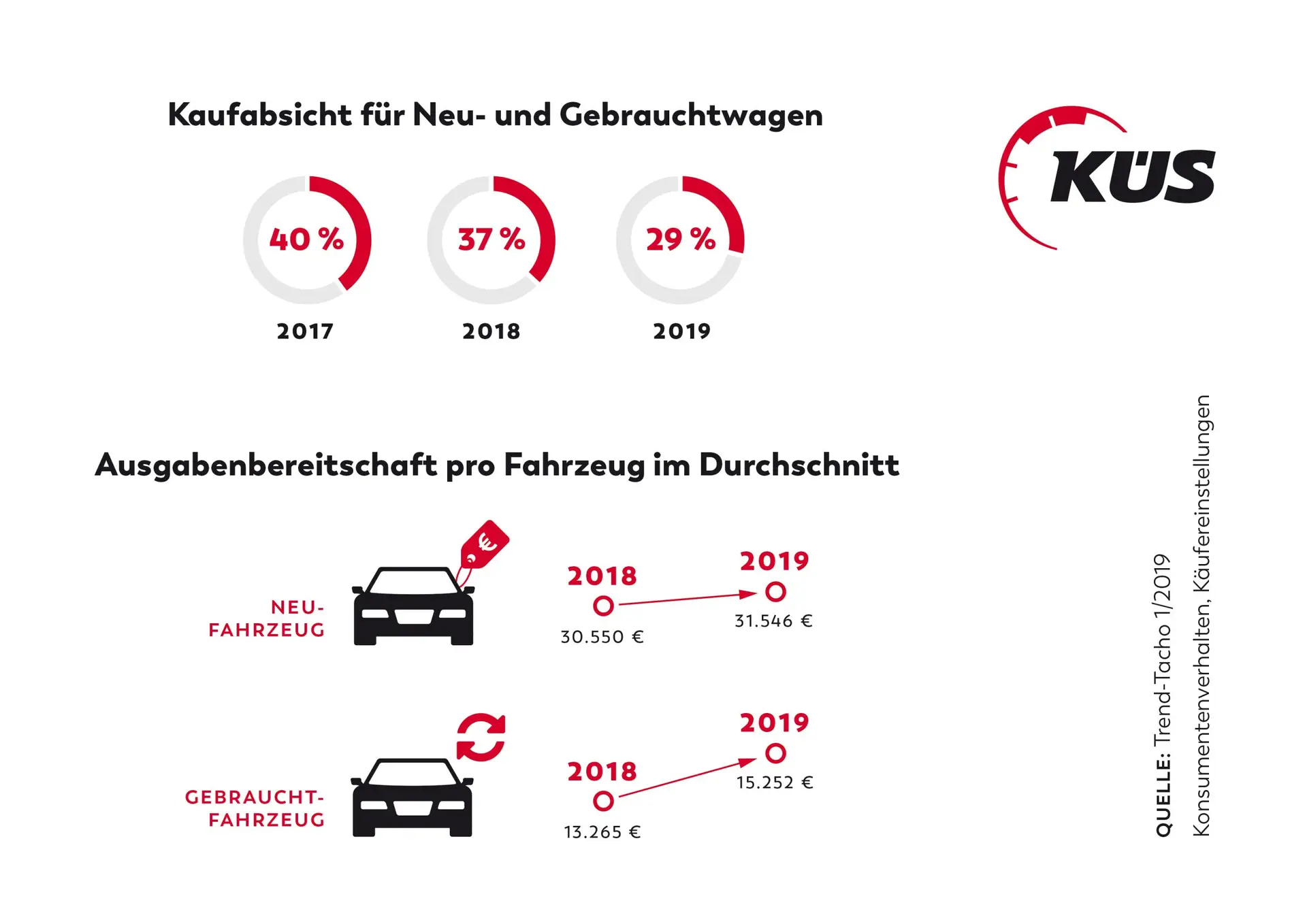 Der Trend-Tacho wird für die Prüforganisation KÜS und das Fachmagazin kfz-betrieb vom Kölner Institut BBE Automotive GmbH erstellt. Es handelt sich um eine Mixed-Mode-Befragung, telefonisch (CATI) von 300 Personen und online (CAWI) von 700 Personen. Zielpersonen sind Pkw-Fahrer, die im Haushalt für Fragen rund um das Auto mitverantwortlich sind. Die Befragung wurde im März 2019 durchgeführt. Die Gewichtung der Befragungsergebnisse erfolgt mit den KBA-Daten (Bestandsanteile Pkw-Marken, Alterssegmente).