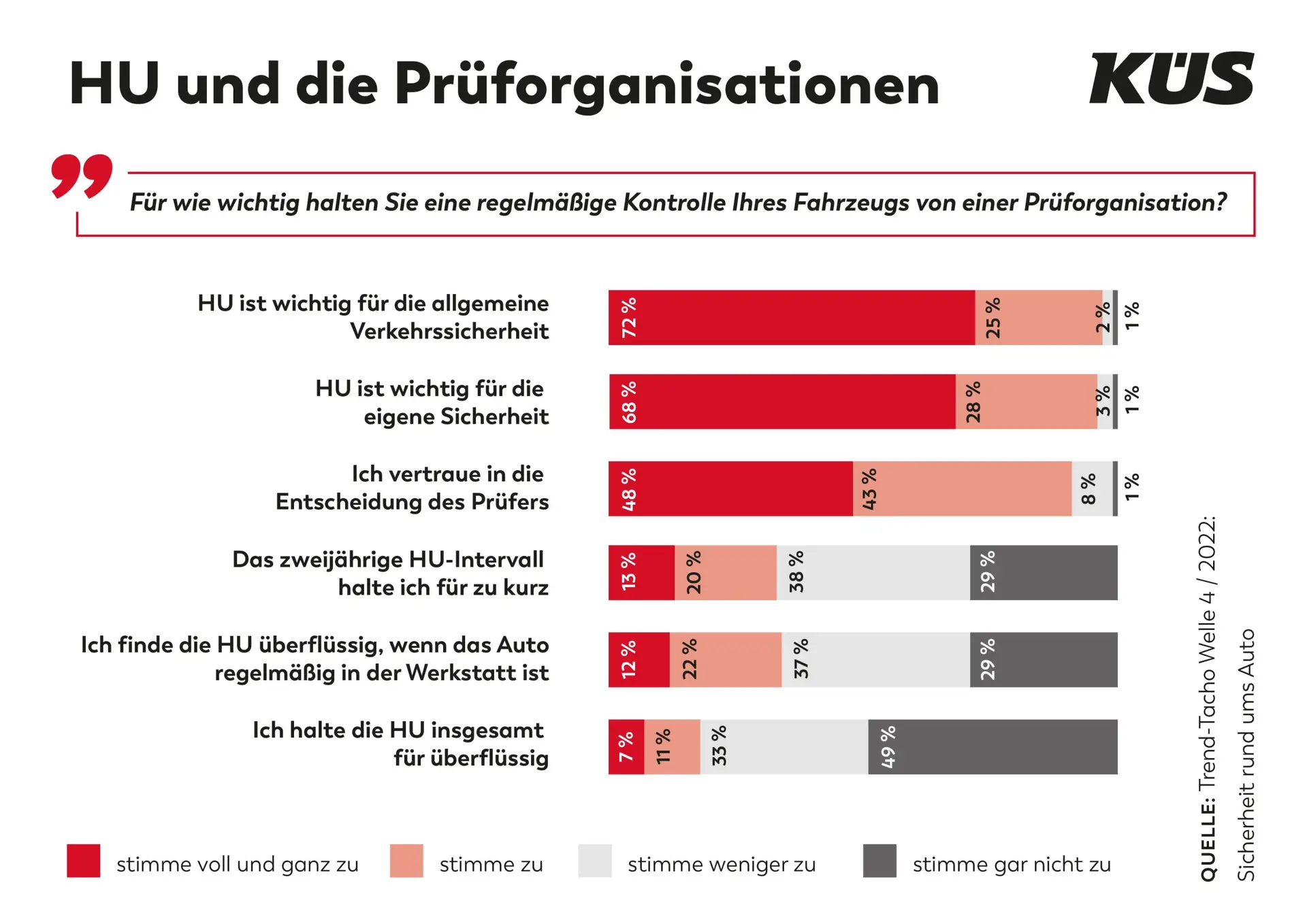Deutsche Autofahrer*innen haben großes Vertrauen in die Hauptuntersuchung (HU). Das belegt der aktuelle KÜS-Trend-Tacho: 97 % der Befragten sehen sie als wichtig an für die allgemeine Verkehrssicherheit, 96 % betonen insbesondere die Bedeutung der HU für die eigene Sicherheit im Straßenverkehr.