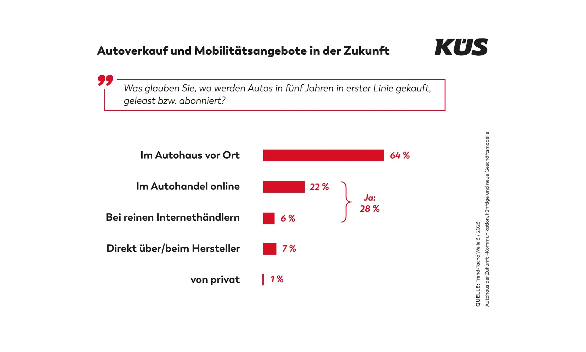 Ähnlich vielfältig wie die Mobilitätsangebote sind auch die Orte, an denen das Geschäft zwischen Autofahrer/innen und dem Verkäufer zustande kommt. Dennoch hat auch hier ein Klassiker die Nase vorn: 64 % glauben an die Zukunft des Autohauses vor Ort, wie wir es traditionell kennen. Nur 28 % sehen die Zukunft des Online-Handels mit Pkw auf die nächsten fünf Jahre hin positiv. Kaum Chancen sehen die Befragten dafür, dass die Hersteller direkt mit den Interessenten ins Geschäft kommen (7 %).